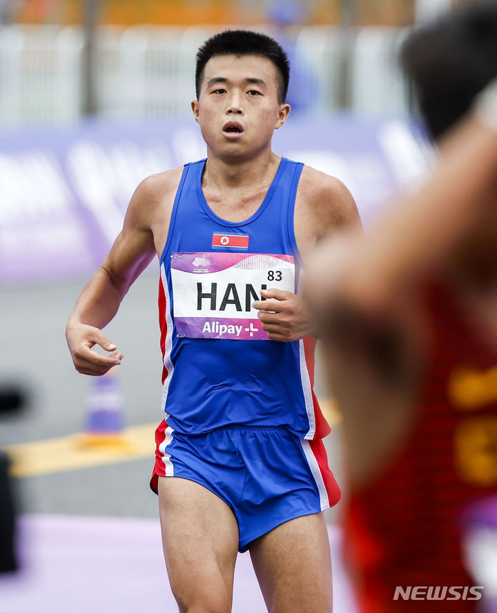 [항저우=뉴시스] 정병혁 기자 = 5일 중국 항저우 첸탕강 스마트 뉴월드 일대에서 열린 2022 항저우 아시안게임 육상 남자 마라톤에서 은메달을 차지한 북한 한일룡이 결승선을 통과한 뒤 자국 응원단을 찾고 있다. 2023.10.05. [email protected]