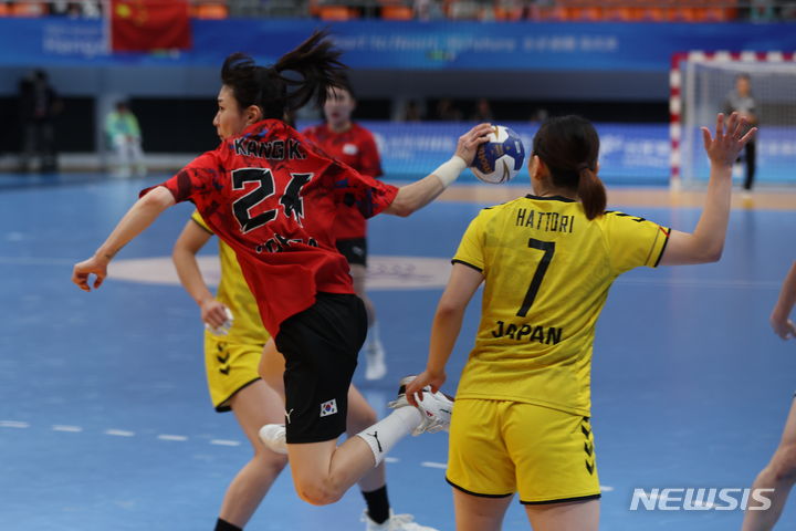 [샤오싱=뉴시스] 고승민 기자 = 5일 중국 항저우 공상대학교 체육관에서 열린 2022 항저우 아시안게임 여자 핸드볼 여자부 결승 한국 대 일본 경기, 한국 강경민이 슛하고 있다. 2023.10.05. [email protected]