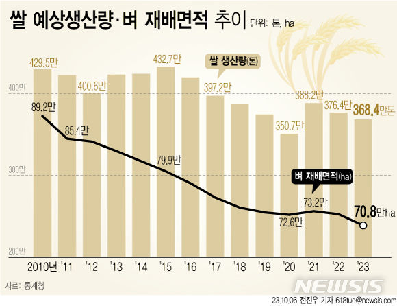 [서울=뉴시스] 6일 통계청에 따르면 올해 쌀 생산량은 368만4000t으로 전년보다 8만t(-2.1%) 감소했다. 정부의 쌀 수급 균형을 위한 정책 등으로 재배면적이 감소하면서 생산량 또한 2년 연속 쪼그라들었다. (그래픽=전진우 기자)