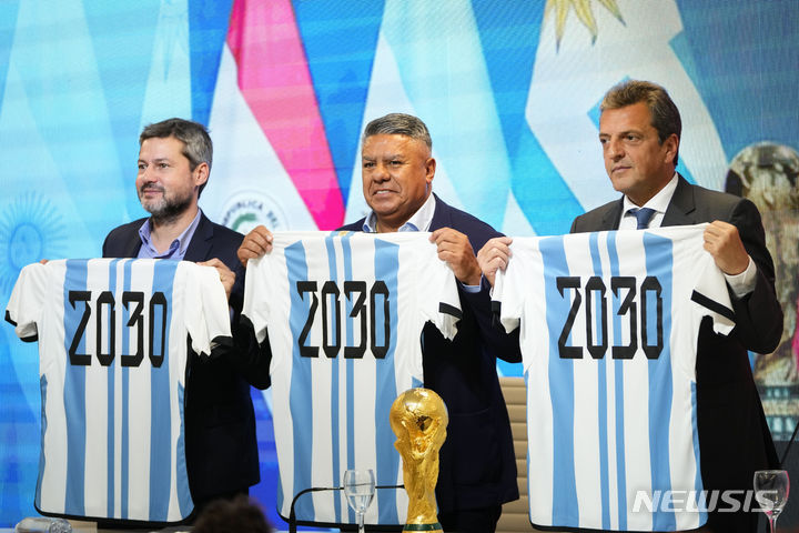 [부에노스아이레스=AP/뉴시스] 세르히오 마사 아르헨티나 경제부 장관 겸 대선 후보, 클라우디오 타피아 아르헨티나 축구협회장, 마티아스 라멘스 아르헨티나 체육부 장관(이상 왼쪽부터)이 5일(현지시각) 부에노스아이레스에서 기자회견 하면서 '2030'이 쓰인 축구 유니폼을 들고 있다. 국제축구연맹(FIFA)은 월드컵 개최 100주년을 기념해 2030 월드컵의 개막 경기를 우루과이, 아르헨티나, 파라과이에서 각각 치른다고 밝혔다. 앞서 FIFA 평의회는 2030 월드컵 개최국을 모로코, 스페인, 포르투갈로 선정하면서 개막전은 남미 3개국에서 치른다고 발표했다. 2023.10.06.