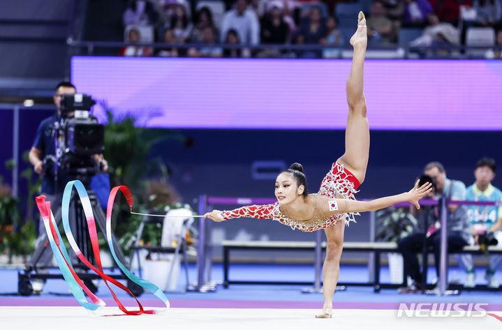 [항저우=뉴시스] 정병혁 기자 = 6일 중국 항저우 황롱스포츠센터 체육관에서 열린 2022 항저우 아시안게임 리듬체조 개인종합 예선 및 단체 결승전 경기, 하수이가 리본 연기를 펼치고 있다. 2023.10.06. [email protected]