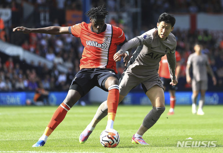 [루턴=AP/뉴시스] 토트넘 홋스퍼의 손흥민이 7일(현지시각) 영국 루턴의 케닐워스 로드 스타디움에서 열린 2023~24시즌 잉글랜드 프로축구 프리미어리그(EPL) 8라운드 루턴 타운과의 경기 중 공을 다투고 있다. 이브 비수마가 전반 종료 직전 퇴장당한 토트넘은 후반 7분 미키 판더펜이 결승 골을 넣으며 1-0으로 승리, 리그 1위로 올라섰다. 2023.10.08.
