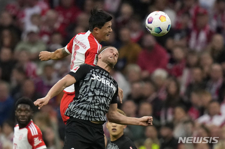 [뮌헨=AP/뉴시스] 바이에른 뮌헨의 김민재가 8일(현지시각) 독일 뮌헨의 알리안츠 아레나에서 열린 2023~24시즌 분데스리가 7라운드 프라이부르크와 경기 중 공중 볼을 다투고 있다. 김민재는 풀타임을 소화했고 팀은 3-0으로 승리해 5승2무로 리그 3위를 기록했다. 2023.10.09.