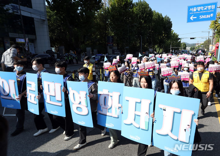 [서울=뉴시스] 최진석 기자 = 서울대병원(서울대병원, 보라매병원) 노조가 무기한 총파업에 돌입한 11일 서울 종로구 마로니에 공원에서 의료공공성 강화, 병원 인력 충원 등을 촉구하며 행진하고 있다. 서울대병원 노조는 이날부터 의료 공공성 강화와 필수인력 충원, 실질임금 인상 등을 촉구하며 필수인력은 유지한 채 무기한 파업에 들어갔다. 2023.10.11. [email protected]