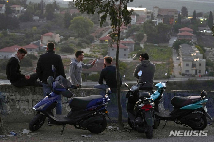 [크파르 킬라=AP/뉴시스] 12일(현지시각) 이스라엘과 국경을 접한 레바논 남부 크파르 킬라에서 레바논 청년들이 맞은편의 이스라엘 마을을 바라보며 얘기를 나누고 있다. 이스라엘군은 레바논과의 국경 주변에 전차와 군 장비를 집결해 레바논 무장 정파 헤즈볼라와도 교전을 벌이고 있어 확전이 우려되고 있다. 2023.10.13.
