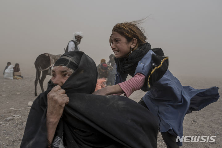 [제데흐잔=AP/뉴시스] 12일(현지시각) 아프가니스탄 헤라트주 지진 피해 지역인 제데흐잔에서 한 소녀가 거친 모래폭풍에 겁을 먹고 울면서 구호 물품을 받고 있다. 2023.10.13.