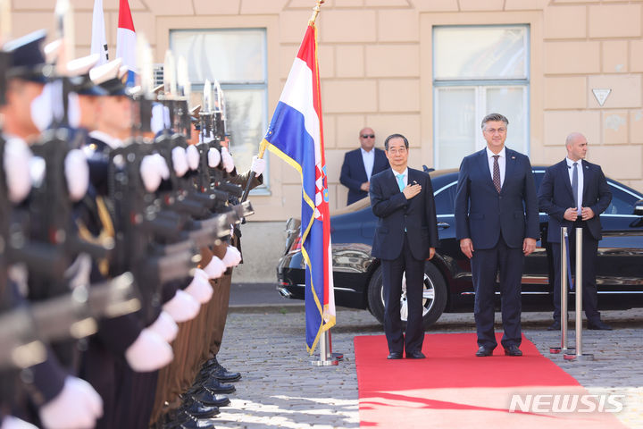 [서울=뉴시스] 배훈식 기자 = 프랑스 등 해외순방에 나선 한덕수 국무총리가 12일(현지시간) 크로아티아 총리실 광장에서 안드레이 플렌코비치 크로아티아 총리와 공식 환영행사를 하고 있다. (사진=국무총리실 제공) 2023.10.13. [email protected]