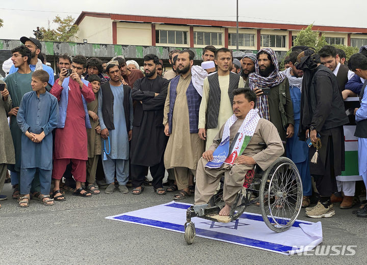 [카불=AP/뉴시스] 13일(현지시각) 아프가니스탄 카불에서 휠체어에 앉은 한 아프간 남성이 이스라엘 국기를 밟고 이스라엘의 가자지구 공습에 반대하는 시위에 참여해 팔레스타인과의 연대를 보여주고 있다. 2023.10.14.