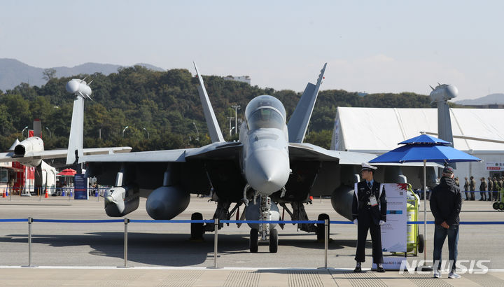 [성남=뉴시스] 황준선 기자 = 16일 경기 성남시 서울공항에서 열린 국내 최대 항공우주·방위산업 전시회 ‘서울 아덱스(ADEX) 2023’ 프레스 데이에 전자전기 EA-18 그라울러가 전시돼 있다. 2023.10.16. [email protected]
