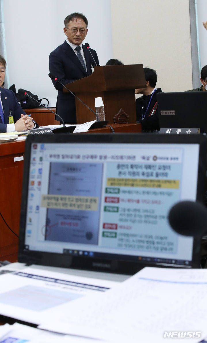 [서울=뉴시스] 고범준 기자 = 강희철 천재교육 대표이사가 16일 오후 서울 여의도 국회에서 열린 정무위원회 공정거래위원회 등에 대한 국정감사에서 의원 질의를 들으며 자료를 보고 있다. 2023.10.16. [email protected]