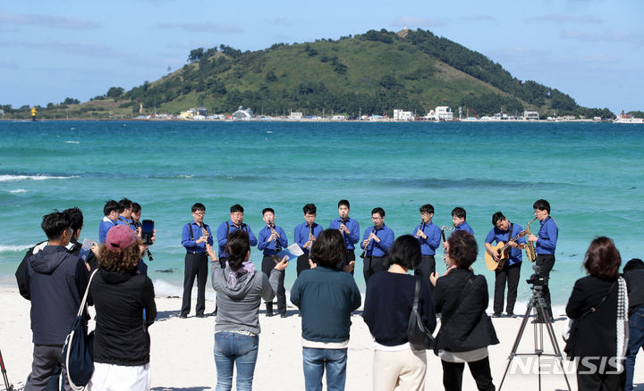 [제주=뉴시스] 우장호 기자 = 맑은 날씨를 보이는 17일 제주시 한림읍 협재해수욕장에서 발달장애인 전문연주단체 ‘드림위드앙상블’이 버스킹 공연을 하고 있다. 제주관광공사와 제주도는 오감과 교감이 있는 제주 여행을 주제로 지난 15일부터 이날까지 도내 일원에서 발달장애인을 위한 무장애 팸투어를 진행 중이다. 2023.10.17. [email protected]