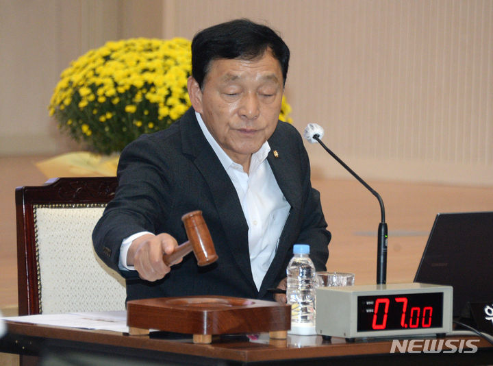 [전주=뉴시스] 김얼 기자 = 김철민 교육위원회 위원장이 17일 전북 전주시 전북대학교에서 열린 2023년도 국회 교육위원회 국정감사에서 시작을 알리며 의사봉을 두드리고 있다. 2023.10.17. [email protected]