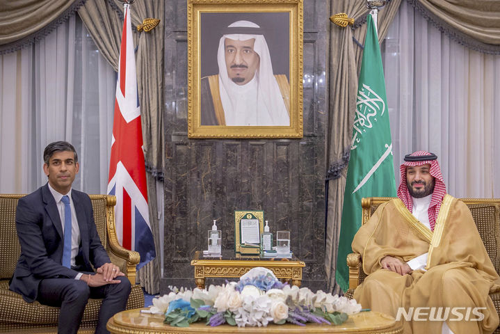 [리야드=AP/뉴시스] 리시 수낵(왼쪽) 영국 총리가 19일(현지시각) 사우디아라비아 수도 리야드에서 무함마드 빈 살만 사우디 왕세자와 회동하고 있다. 수낵 총리는 "장기적 관점에서 사우디가 역내 안정을 도모하는 데 리더십을 발휘해 줄 것을 독려했다"라고 했으며 빈 살만 왕세자는 "가자지구 민간인 공격은 극악무도한 범죄이자 잔인한 공격"이라고 말한 것으로 알려졌다. 2023.10.20.