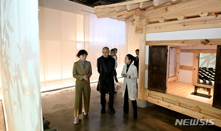 [광주=뉴시스] 김혜인 기자 = 유인촌 문화체육관광부 장관이 20일 오후 광주 북구 광주비엔날레 전시관에서 진행 중인 제10회 광주디자인비엔날레를 찾아 전북 완주의 '아원고택'을 미디어아트와 건축디자인으로 재해석한 '아원의 시(詩)공간'작품을 둘러보고 있다. 2023.10.20. [email protected]