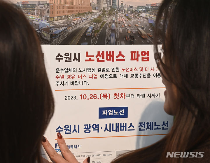 [수원=뉴시스] 김종택기자 = 경기도버스노동조합 총파업을 하루 앞둔 25일 오후 경기도 수원역 인근 버스 정류장에서 수원시청 관계자들이 파업 예고 안내문을 붙이고 있다. 노조는 이날 경기지방노동위원회에서 열리는 최종 조정회의가 결렬되면 26일 첫차부터 전면 파업에 돌입한다고 밝혔다. 2023.10.25. [email protected]