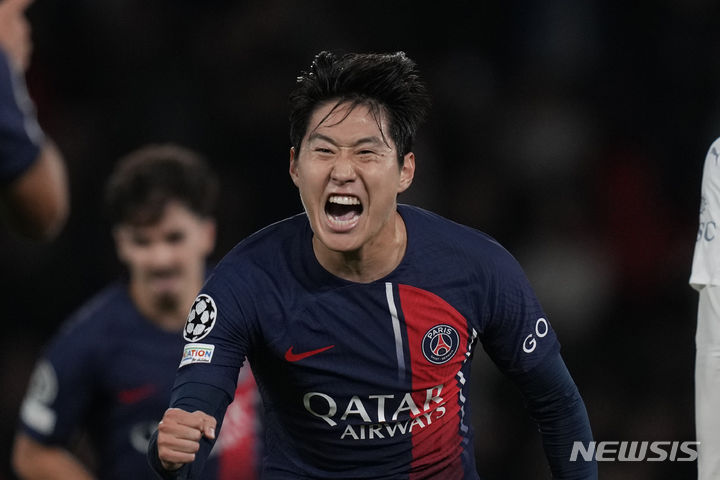 [파리=AP/뉴시스] 파리 생제르맹(PSG)의 이강인이 25일(현지시각) 프랑스 파리의 파르크 데 프랭스에서 열린 2023-24시즌 유럽축구연맹(UEFA) 챔피언스리그(UCL) 조별리그 F조 3차전 AC 밀란(이탈리아)과 경기 후반 44분 팀의 세 번째 득점 후 환호하고 있다. 후반 교체 출전한 이강인은 PSG 데뷔골을 UCL에서 기록하며 팀의 3-0 승리에 기여했다. 2023.10.26.