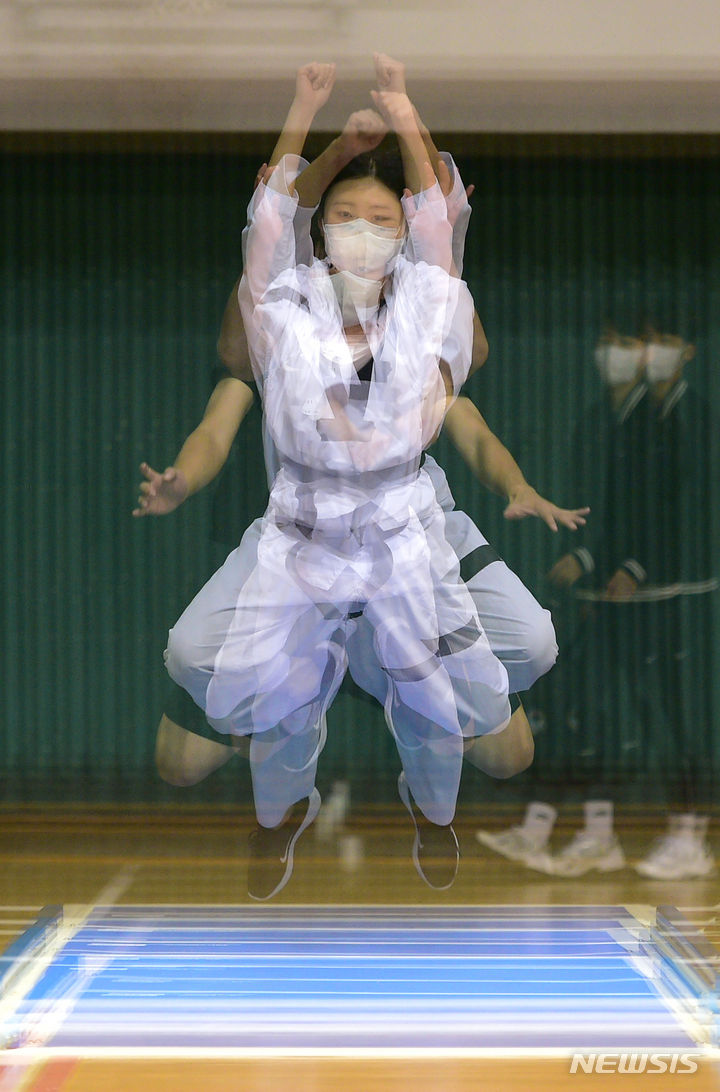 [대구=뉴시스] 이무열 기자 = 26일 대구 달서구 계명대학교 성서캠퍼스 체육관에서 열린 2024학년도 신입생 수시모집 실기 고사에서 태권도학과에 지원한 수험생들이 제자리멀리뛰기 시험을 보고 있다. 2023.10.26. [email protected]