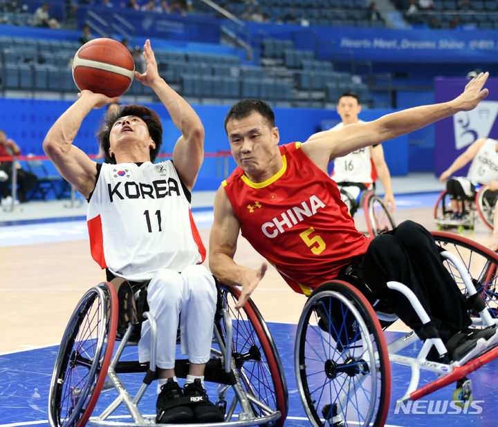 [항저우=뉴시스] 사진공동취재단 = 곽준성이 26일 항저우 올림픽 스포츠센터 체육관에서 열린 휠체어농구 준결승전 중국과 경기에서 슛을 시도하고 있다. 2023.10.26. [email protected]