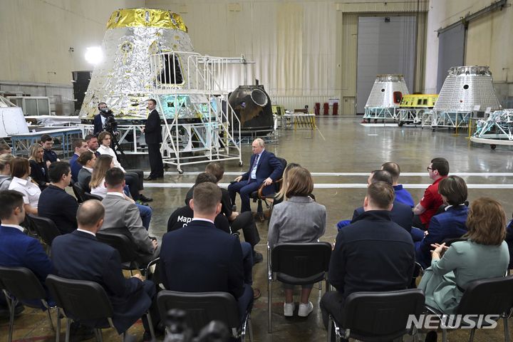 [코롤료프=AP/뉴시스] 블라디미르 푸틴 러시아 대통령이 26일(현지시각) 모스크바 외곽의 코롤료프에 있는 에네르기아 우주로켓공사(RSC)를 방문해 젊은 과학자들과 간담회를 하고 있다. 2023.10.27.