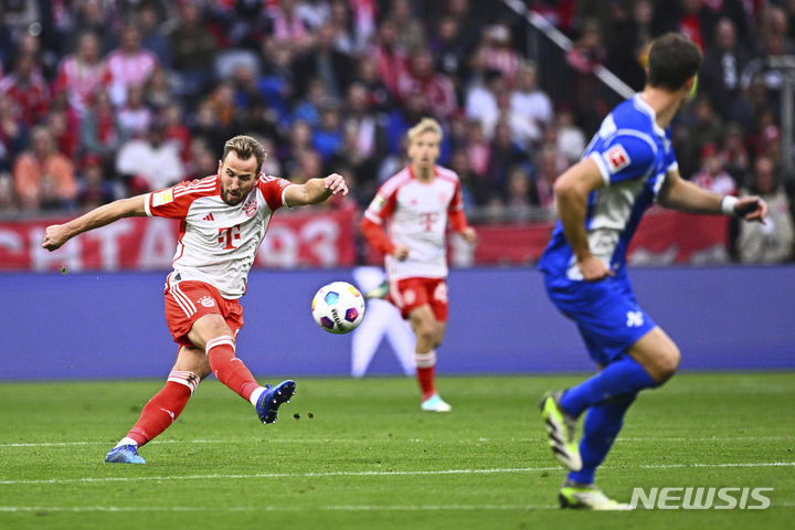 [뮌헨=AP/뉴시스] 바이에른 뮌헨의 해리 케인이 28일(현지시각) 독일 뮌헨의 알리안츠 아레나에서 열린 2023-24시즌 독일 분데스리가 9라운드 다름슈타트와의 경기 후반 24분 팀의 다섯 번째 골을 넣고 있다. 케인이 해트트릭을 기록한 뮌헨이 8-0 대승을 거두고 리그 1위로 올라섰다. 2023.10.29.