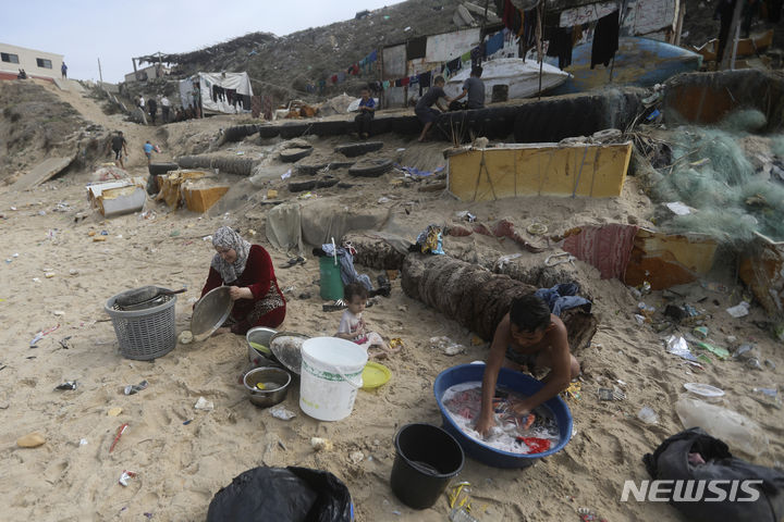[가자지구=신화/뉴시스] 심한 물 부족을 겪고 있는 팔레스타인 주민들이 29일(현지시각) 가자지구 데이르 알발라 해변에서 바닷물로 설거지와 빨래를 하고 있다. 2023.10.30.