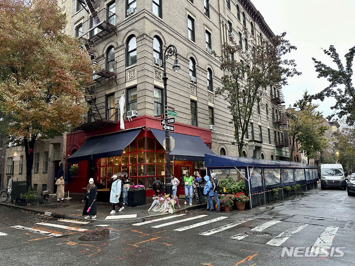 [뉴욕=AP/뉴시스] 29일(현지시각) 미국 뉴욕의 '프렌즈 빌딩'으로 알려진 건물 밖에 배우 매튜 페리의 임시 추모소가 마련돼 팬들이 꽃다발을 놓고 고인을 추모하고 있다. 인기 드라마 '프렌즈'에서 '챈들러 빙' 역으로 큰 인기를 얻었던 페리가 28일 로스앤젤레스 자택 욕조에서 숨진 채 발견됐다. 향년 54세. 2023.10.30.