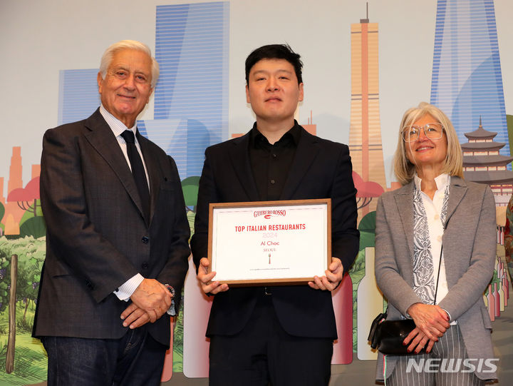 [서울=뉴시스] 김명년 기자 = 30일 오후 서울 중구 앰배서더서울풀만호텔에서 이탈리아 와인·음식 전문 미디어 감베로 로쏘(Gambero Rosso) 주최로 열린 '톱 이탈리아 와인 로드쇼'에서 한국 최고의 이탈리안 레스토랑으로 선정된 알척 관계자가 수상 후 기념촬영을 하고 있다. 2023.10.30. [email protected]