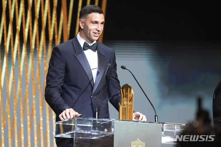[파리=AP/뉴시스] 애스턴 빌라 골키퍼 에밀리아노 마르티네스(아르헨티나)가 30일(현지시각) 프랑스 파리의 샤틀레 극장에서 열린 2023 발롱도르 시상식 최우수 골키퍼 상인 야신상을 받고 소감을 말하고 있다. 2023.10.31.