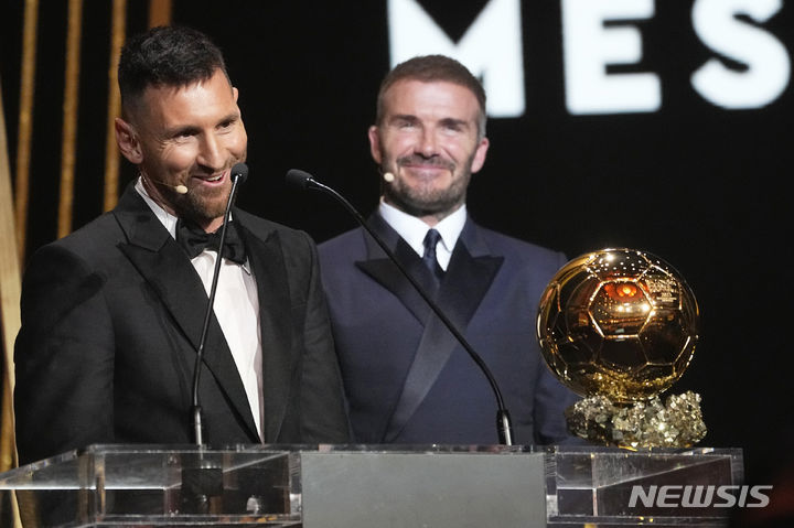 [파리=AP/뉴시스] 인터 마이애미의 리오넬 메시(아르헨티나)가 30일(현지시각) 프랑스 파리의 샤틀레 극장에서 열린 2023 발롱도르 시상식에서 인터 마이애미 공동 구단주 데이비드 베컴(오른쪽)으로부터 남자 선수 부문 발롱도르 트로피를 받은 후 수상 소감을 말하고 있다. 메시는 엘링 홀란(2위), 킬리안 음바페(3위)를 제치고 생애 여덟 번째 발롱도르를 받았다. 2023.10.31.
