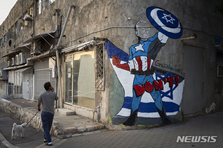 [텔아비브=AP/뉴시스] 30일(현지시각) 이스라엘 텔아비브 거리에 이스라엘을 수호하는 슈퍼 히어로로 묘사된 조 바이든 미국 대통령 벽화가 그려져 있다. 이-하마스 전쟁에서 이스라엘을 강력히 지지하는 바이든 대통령의 인기가 이스라엘 내에서 치솟고 있다. 2023.10.31.