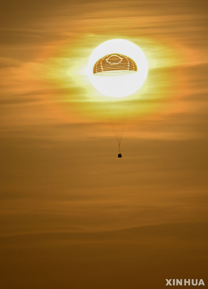 [둥펑=신화/뉴시스] 중국 우주인 3명을 태운 선저우-16 유인우주선 캡슐이 31일(현지시각) 중국 네이멍구 자치구 둥펑 착륙장에 귀환하고 있다. 징하이펑, 주양주, 구이하이차오 등 3명의 우주인은 지난 5월 30일 선저우16호를 타고 중국 우주정거장 '톈궁'에 도착, 5개월간 생명공학과 의료 관련 실험을 수행한 후 이날 귀환했다. 2023.10.31.