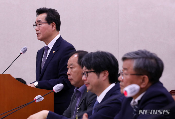 [서울=뉴시스] 고범준 기자 = 정황근 농림축산식품부 장관이 31일 오후 서울 여의도 국회에서 열린 농림축산식품해양수산위원회 전체회의에서 수입위생 조건안 심의의 건에 대해 경과보고를 하고 있다. 2023.10.31. [email protected]