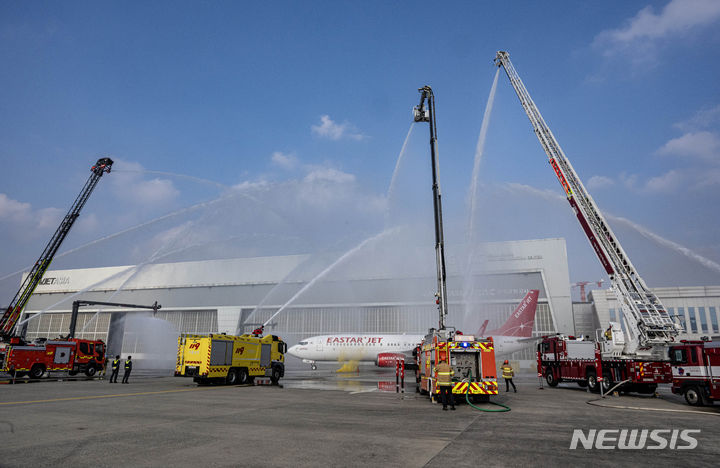 [인천공항=뉴시스] 공항사진기자단 = 한국공항공사, 강서소방서, 강서구청 등 유관기관과 합동으로 31일 오후 서울 김포국제공항 국제선 계류장에서 ‘2023년 재난대응 안전한국훈련’ 항공기 사고수습 종합훈련이 열리고 있다. 2023.10.31. [email protected]