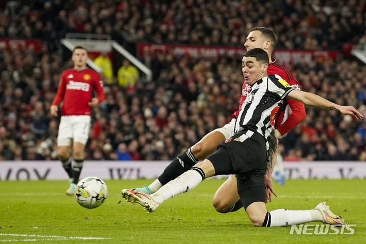 [맨체스터=AP/뉴시스] 뉴캐슬 유나이티드의 미겔 알미론이 1일(현지시각) 영국 맨체스터의 올드 트래퍼드 경기장에서 열린 2023-24시즌 EFL(카라바오)컵 16강전 맨체스터 유나이티드와의 경기 전반 28분 선제골을 넣고 있다. 뉴캐슬이 디펜딩 챔피언 맨유를 3-0으로 완파하고 8강에 올랐다. 2023.11.02.