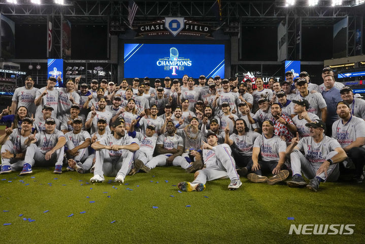 [피닉스=AP/뉴시스] 텍사스 레인저스 선수들이 1일(현지시각) 미 애리조나주 피닉스의 체이스필드에서 열린 2023 메이저리그(MLB) 월드시리즈(WS) 5차전에서 애리조나 다이아몬드백스를 물리친 후 우승컵을 앞에 두고 기념 촬영하고 있다. 텍사스는 애리조나를 5-0으로 완파하고 시리즈 전적 4승1패로 창단 첫 WS 정상에 올랐다. 2023.11.02.