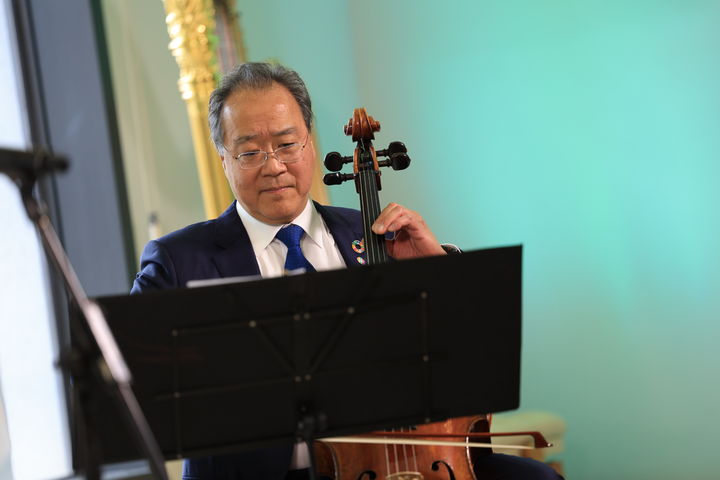 [서울=뉴시스] 2일 서울 용산구 대통령실 파인그라스에서 열린 ‘발달장애 예술인과 함께하는 요요마 토크콘서트’에서 첼리스트 요요마(Yo-Yo Ma)가 연주를 하고 있다. (사진=대통령실 제공) 2023.11.02. [email protected] *재판매 및 DB 금지