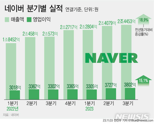 [서울=뉴시스] 3일 네이버는 올 3분기 연결 재무제표 기준 매출 2조4453억원, 영업이익 3802억원을 기록했다고 공시했다. 전년 동기 대비 매출은 18.9% 늘었고, 영업이익은 15.1% 증가했다. 매출과 영업이익 모두 역대 분기 최대 규모다. (그래픽=전진우 기자)