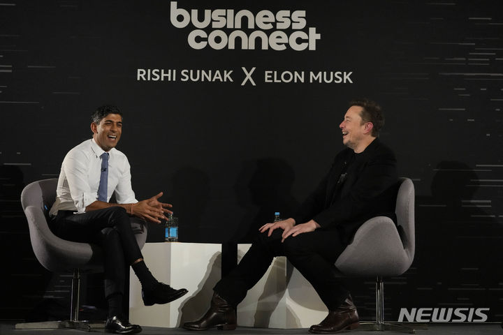 [런던=AP/뉴시스] 리시 수낵(왼쪽) 영국 총리가 2일(현지시각) 런던에서 열린 '비즈니스 커넥트' 행사에 참석해 일론 머스크 테슬라 최고경영자(CEO)와 대담하고 있다. 머스크는 "인공지능(AI)이 있는 미래는 '보편적 기본소득'이 아닌 '보편적 고소득'의 풍요로운 시대가 될 것"이라며 "로봇이 좋은 친구가 될 것이지만 우려도 해야 한다"라고 말했다. 2023.11.03.