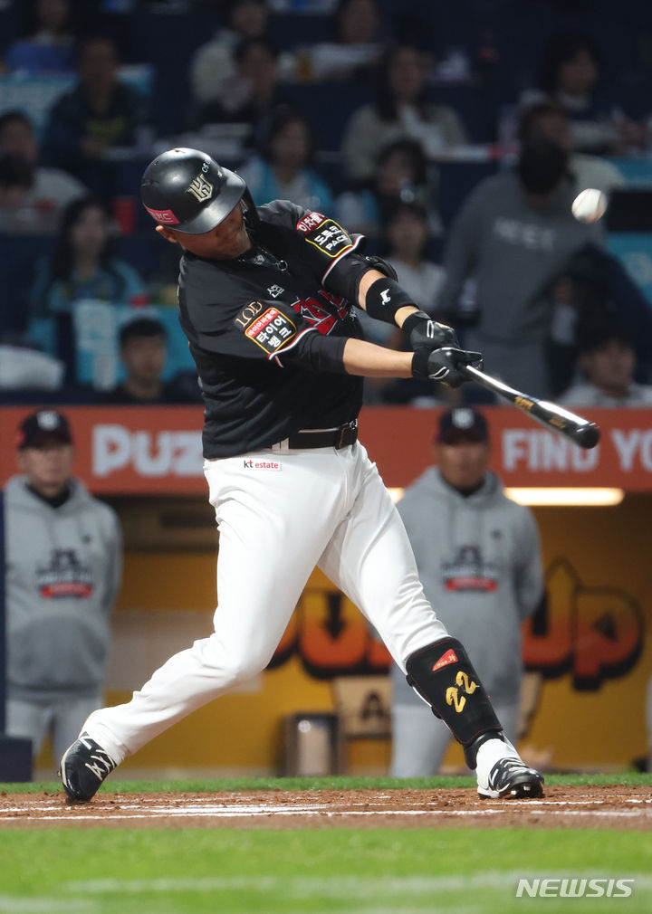 [창원=뉴시스] 김금보 기자 = 3일 오후 경남 창원NC파크에서 열린 2023 KBO 플레이오프 KT 위즈 대 NC 다이노스의 4차전 경기, 1회초 1사 1,3루 KT 장성우가 희생플라이를 치고 있다. 2023.11.03. [email protected]