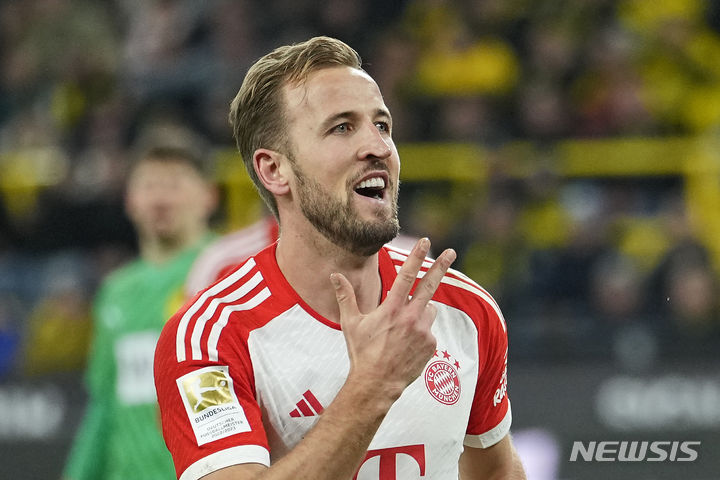 [도르트문트=AP/뉴시스] 바이에른 뮌헨의 해리 케인이 4일(현지시각) 독일 도르트문트의 지그날 이두나 파크에서 열린 2023-24 독일 분데스리가 11라운드 보루시아 도르트문트와 경기 후반 추가 시간 해트트릭을 완성하며 손가락 세 개를 펴 보이고 있다. 있다. 김민재는 풀타임을 소화했고 뮌헨은 케인이 해트트릭을 기록하며 4-0 완승을 거뒀다. 2023.11.05.