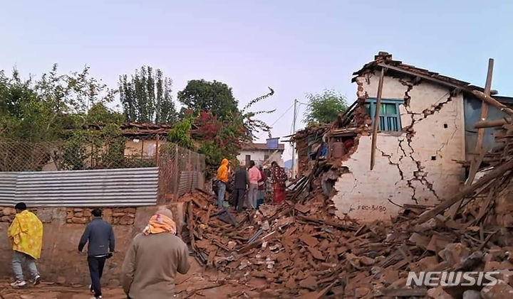 [자자르콧=AP/뉴시스] 네팔 총리실이 제공한 사진에 4일(현지시각) 네팔 북서부 카리날리주에서 발생한 지진으로 가옥이 무너져 있다. 현지 당국은 카르날리주 자자르콧 지역에서 규모 5.6의 강진이 발생해 지금까지 약 140명이 숨지고 수백 명이 다쳤다고 밝혔다. 2023.11.04.