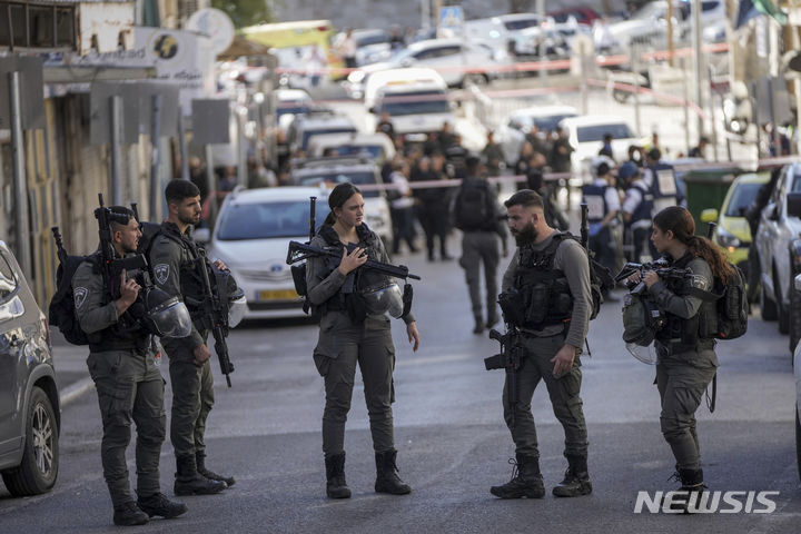[예루살렘=AP/뉴시스] 이스라엘 경찰관들이 6일(현지시각) 예루살렘 동부에서 발생한 칼부림 현장을 조사하고 있다. 경찰은 16세 팔레스타인 소년이 경찰서 인근에서 이스라엘 경찰관 2명을 흉기로 찔러 1명이 중태라고 밝혔다. 이 소년은 경찰에 사살됐다. 2023.11.06.