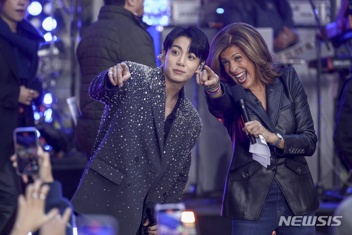 [뉴욕=AP/뉴시스] 방탄소년단(BTS)의 정국(왼쪽)이 8일(현지시각) 미국 뉴욕의 록펠러 플라자에서 열린 NBC '투데이 쇼'에 출연해 진행자인 호다 코트브와 포즈를 취하고 있다. 정국은 '투데이 쇼'의 시티콘서트 시리즈 중 하나로 뉴욕 중심가에서 단독 야외 공연을 펼쳐 히트곡 '세븐' 등을 열창했다. 2023.11.09.