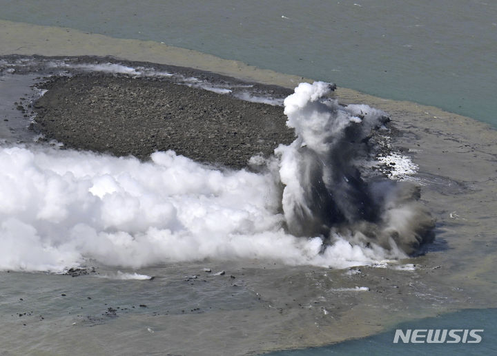 [오가사와라=AP/뉴시스] 지난달 30일 일본 도쿄 남부 오가사와라 군도 이오토섬 앞바다에서 수증기가 뿜어져 나오고 있다. 현지 언론은 이 섬 앞바다 1㎞ 부근에서 분화가 일어난 후 대량의 암석이 쌓이며 지름 100m가량의 새로운 섬이 생겼다고 보도했다. 2023.11.09.