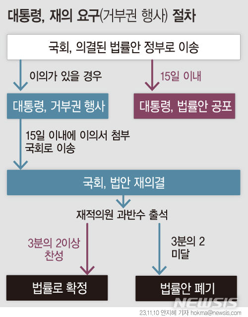 [서울=뉴시스]여야 대립이 첨예했던 '노란봉투법'이 지난 9일 국회 본회의를 통과했다.정부·여당의 건의에 따라 윤석열 대통령이 재의요구권(거부권)을 행사할 수 있다. 대통령의 거부권 행사로 국회에 돌아온 법안이 다시 가결되려면 재적의원 3분의 2(200명) 이상 동의가 필요하다. (그래픽=안지혜 기자)