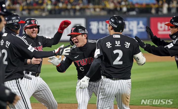 [수원=뉴시스] 김금보 기자 = 10일 오후 경기 수원시 kt위즈파크에서 열린 2023 KBO 한국시리즈 3차전 LG 트윈스와 kt 위즈의 경기, 9회초 2사 1, 2루 LG 오지환이 3점 홈런을 치고 기뻐하고 있다. 2023.11.10. [email protected]