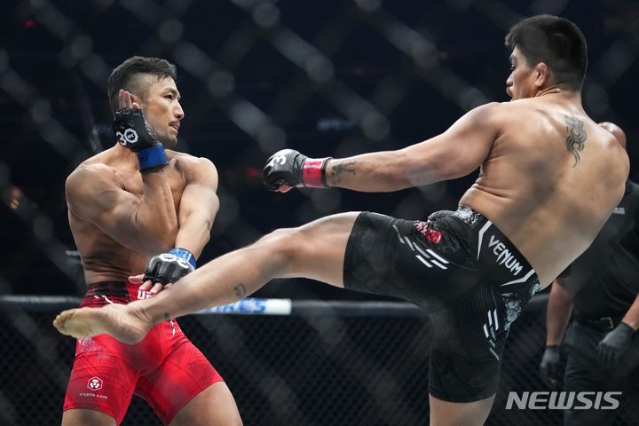 [뉴욕=AP/뉴시스] 강경호(왼쪽)가 11일(현지시각) 미국 뉴욕의 매디슨스퀘어가든에서 열린 UFC 295 언더카드 138파운드(62.6kg) 계약 체중 경기에서 존 카스타네다(미국)와 경기하고 있다. 강경호는 심판 전원일치 판정패(27-30 27-30 27-30)로 최근 UFC 2연승을 마감했다. 2023.11.12.