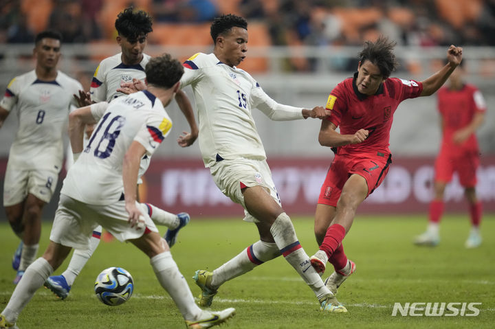 [자카르타=AP/뉴시스] 윤도영(오른쪽)이 12일(현지시각) 인도네시아 자카르타의 인터내셔널 스타디움에서 열린 2023 국제축구연맹(FIFA) 17세 이하(U-17) 남자 월드컵 조별리그 E조 1차전 미국과 경기 중 공을 다투고 있다. 변성환 감독이 이끄는 U-17 축구대표팀은 전반 35분 김명준이 동점 골을 넣었으나 후반 2실점 하며 1-3으로 패했다. 2023.11.13.