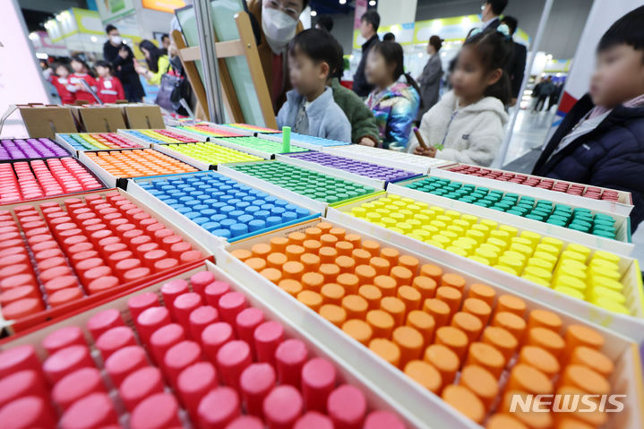 [서울=뉴시스] 홍효식 기자 = 15일 서울 강남구 코엑스에서 열린 제35회 서울국제문구·사무용품종합전시회를 찾은 어린이들이 알록달록한 분필을 체험하고 있다. 2023.11.15. [email protected]