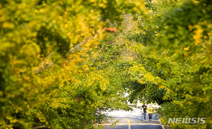 [제주=뉴시스] 우장호 기자 = 평년기온을 회복해 비교적 포근한 날씨를 보인 15일 오후 제주대학교 교직원 아파트 앞 은행나무 가로수길이 노랗게 물들어 늦가을 정취를 물씬 풍기고 있다. 2023.11.15. [email protected]